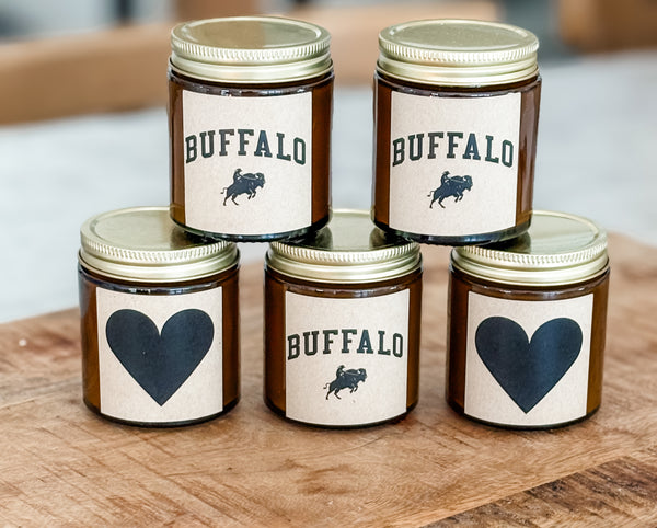 Welcome to Bills Country! This candle gives a Western, Western NY vibe! Light this mini with wood wick in our pretty amber jar to set the mood or on Game Day!
